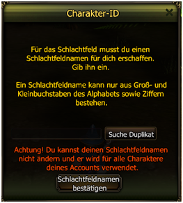 - La prima volta dovrai inserire il tuo nome per il Campo di Battaglia. Attenzione: questo nome sarà valido per l'intero account, ciò significa che lo userai per tutti i personaggi con i quali entrerai nel Campo di Battaglia. Quindi scegli il tuo nome con cura!